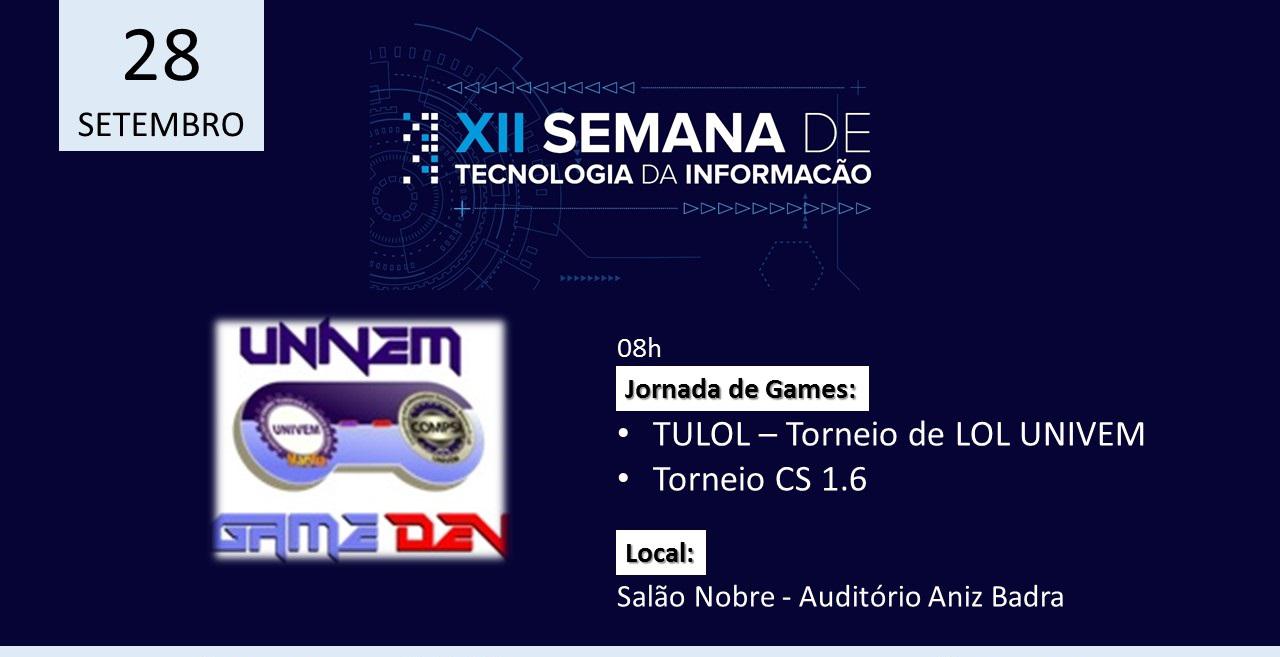 - O TULOL: Torneio Univem de League Of Legends (TULOL): Competição para todos. Cada equipe terá 5 integrantes com direito a 1 reserva. São 16 vagas no total e o minimo de 4 vagas a serem preenchidas. O TULOL acontece no dia 28/09 (sábado) durante o dia; As finais do torneio será transmitidas ao vivo e poderão ser acompanhadas nos laboratórios do Univem; Não haverá premiação somente troféus para o primeiro e segundo lugar.