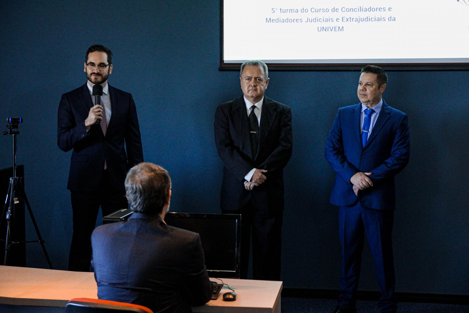 Em fala, Leonardo Monti Gomes, Coordenador do Centro de Educação Continuada do Univem e Gestor do departamento de Marketing da Instituição. Ao centro, professor do curso de Direito, Coordenador do curso de Capacitação de Conciliadores e Mediadores, e Coordenador do NPJ Univem, Luciano Ramires. Á direita da imagem, Dr. Paulo César Dias, também Coordenador do curso de Capacitação