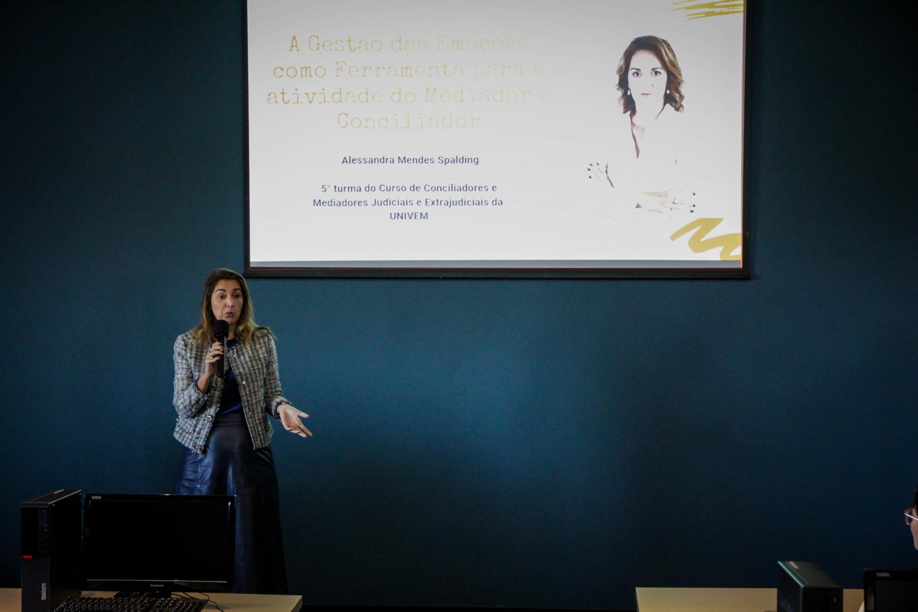 Em sua visita ao Univem, Dra. Alessandra ministrou uma palestra aos ingressantes do Curso de Capacitação de Conciliadores e Mediadores Judiciais e Extrajudiciais, sobre a Gestão das Emoções como ferramenta para a atividade do Mediador e Conciliador e também comentou sobre a sua trajetória profissional e fatores pessoais que desencadearam sua escolha para a profissão. Em 2020, para as mais de 114 milhões de ações judiciais a todo vapor em território brasileiro, existiam menos de 20 mil magistrados. Eram 18.091 juízes para solucionar e sentenciar 114 milhões de processos. Com este modelo de capacitação que o Univem e outras Instituições de Ensino do Estado oferecem, os capacitados em Conciliação e Mediação, podem agir de forma a auxiliar mais de 18 mil juízes, em milhões de ações judiciais.