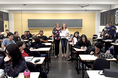 Ao final da apresentação a coordenadora adjunta do curso e responsável pela disciplina de Computação Gráfica, Profa. Marieta Kepler entregou o Certificado de Participação Especial para a designer Taty Coppola.