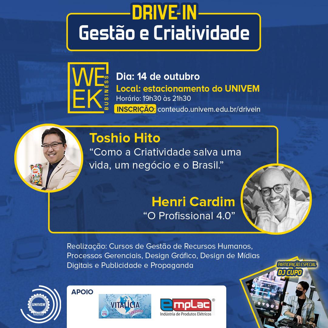 O “Drive-in Gestão e Criatividade” vai trazer duas palestras: “Como a criatividade salva uma vida, um negócio e o Brasil”, ministrada pelo empresário, fundador da Pop’s Fantasy, Toshio Hito, e “O Profissional 4.0”, pelo especialista em formação de líderes de alta performance, Consultor Empresarial, professor em MBA de Marketing e Executive Leader Coaching, Prof. Henri Cardim. Além disso, vai contar com a participação do DJCupo para interagir com a galera.
