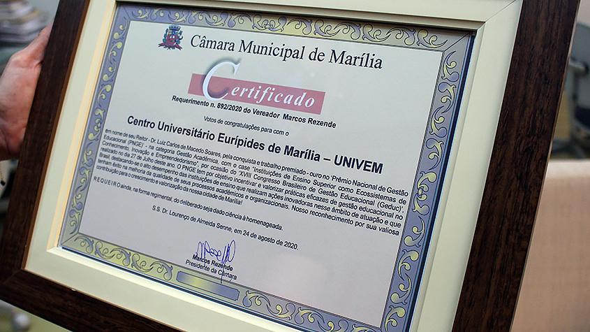 O Centro Universitário Eurípides de Marília – UNIVEM recebeu da Câmara Municipal de Marília os votos de congratulações pela conquista no Prêmio Nacional de Gestão Educacional (PNGE), realizado no XVIII Congresso Brasileiro de Gestão Educacional (GEduc).